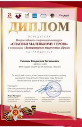 Работа енисейского ученика МАОУ СШ № 1 им. И. П. Кытманова Владислава Галанина завоевала 1 место во Всероссийском конкурсе «Спасибо маленькому герою» в номинации «Проза»!