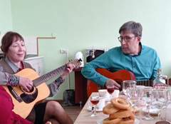 Александр Дмитриевич Дудин (Поэт и композитор-песенник. Автор гимна города Енисейска. Обладатель звезды "Наследие" Императорского дома Романовых и медали Международного конкурса имени равноапостольных святых Кирилла и Мефодия) любезно пригласил клуб «Вдохновение» и ветеранов городского совета на презентацию своей новой книги стихов «Театр овечек». Собрались гости за круглым столом, там уже кипели чайники, а столы ломились от сладких вкусняшек: конфеты, пироги, рулеты, печенье - всё и не перечислить. В тёплой дружеской обстановке началась беседа. Знакомство с творчеством поэта всегда приятно и интересно. В своей новой книге автор предлагает несколько совершенно разных по жанру и стилю произведений. Всегда удивительно, как в одном человеке (авторе) помещается столько художественных образов, как ловко он культивирует сюжет и поэтическую форму... Александр сопровождал свои выступления исполнением любимых песен под гитару. Несколько песен и романсов спела бард Светлана Грабчук. Затем гости поделились успехами. Т. В Лубошникова презентовала две книжки: "Клуб "Вдохновения" и "Мелодия души". С клубом "Автограф" мы дружим уже не первый год. Нам очень нравится собираться вместе, друг от друга мы черпаем неиссякаемую силу творчества, новые идеи. Так получилось и в этот раз. Невольно разговор зашёл о детстве. И все наперебой рассказывали о том счастливом времени, несмотря на то, что у многих ветеранов оно было необычным и трудным. Каждый рассказ был своеобразен, интересен, порой ошеломляющим. Вот и решили, что к следующей встрече каждый ветеран принесёт письменный рассказ о моментах из своего детства. Затем выпустим книгу воспоминаний... Э. П. Демидова читала стихи своего талантливого ученика Александра Дудина и им гордилась. Все вместе мы пели песни под гитару, делились своими впечатлениями о жизни. Как хорошо, когда есть на Земле люди, с которыми уютно и тепло!