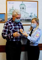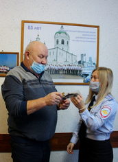 В честь предстоящего праздника всех мужчин, инспектор ГИБДД поздравила ветеранов милиции, вручила им небольшие подарки и памятные юбилейные значки «85 лет ОРУД-ГАИ-ГИБДД».