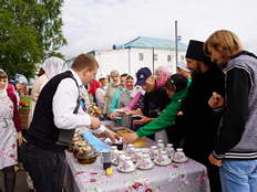 Не взирая на пасмурное небо и прохладный ветерок всем гостям монастыря было тепло - ведь каждый мог продегустировать горячий сибирский чай с травами и медом! Такой напиток согревает не только тело, но и душу!