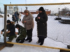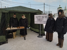 На соборную площадь вынесли приспособления для плетения сетей, которые отправляют в зону СВО. Каждому желающему показывали, как правильно нарезать полосы для плетения, как их вплетать в сетки. Акция длилась не более часа, но желающих плести сети и получить кусочек чёрного «блокадного» хлеба нашлось немало.