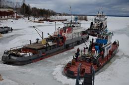 Новые корабли уже готовы к навигации, ждут, когда лед отойдет и даст им свободный ход по воде могучего Енисея.