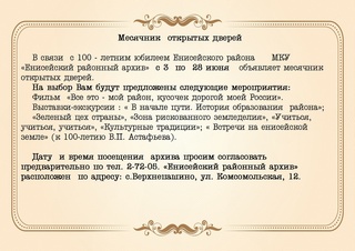 МКУ «Енисейский районный архив» приглашает на месячник открытых дверей, посвящённый 100-летию со дня образования Енисейского района.