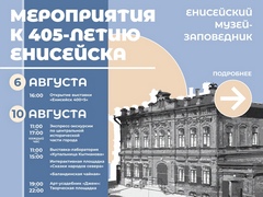 Енисейский музей-заповедник готовится отмечать 405-летие нашего города, и подготовил для вас к этой дате ряд познавательных и увлекательных мероприятий. Тематические выставки, экскурсии, интерактивные и творческие площадки с яркими выступлениями.