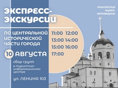 10 августа 2024 года экспресс-экскурсии по центральной исторической части города в: 11:00, 12:00, 13:00, 14:00, 15:00, 16:00 и 17:00. Сбор групп в туристско-информационном центре Енисейского музея-заповедника (ул. Ленина, 103).