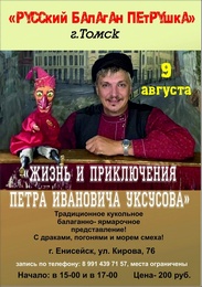Театр «Лешуня» пригласил поздравить вас с Днём города самого настоящего петрушечника, Александра Гринчука и "Русский балаган Петрушка"! Вас ожидает традиционное кукольное балаганно-ярмарочное представление. С драками, погонями и морем смеха! Запись по телефону: 8 991 439 71 57, места ограничены.