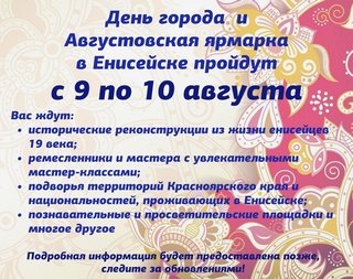 10 августа 2024 года Енисейск приглашает жителей и гостей города на XVI Августовскую ярмарку!