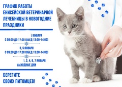 Главная страница / Новости / 2025 / January / Уважаемые жители Енисейска и Енисейского района! Информация для владельцев домашних животных! График работы Енисейской ветеринарной лечебницы в январе 2025 года!