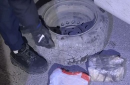В ходе досмотра транспортного средства оперативники обнаружили и изъяли два полимерных свёртка с неизвестным веществом внутри, которые были спрятаны в запасном колесе, прикрученном к дну автомобиля.