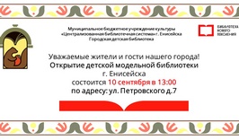 Уважаемые жители Енисейска и Енисейского округа! Предлагаем вам ознакомиться с мероприятиями первого дня работы МОДЕЛЬНОЙ ДЕТСКОЙ БИБЛИОТЕКИ ЕНИСЕЙСКА!