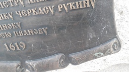 На картуше уже есть имена людей достойных, которые первыми ступили на берег Енисея, где и был основан наш город. Но, видимо, Ваня, Настя, Никита и Соня решила, что их имена, нацарапанные корявыми каракулями более достойны, чтобы красоваться на памятнике основателям Енисейска.